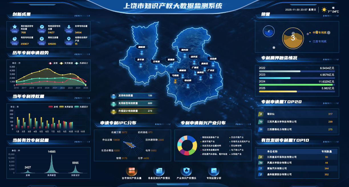 项目成果之一的知识产权智能化数字大屏(即知识产权大数据监测系统)依托国产自主研发数据库平台,通过实时展示全市专利授权量、有效量、行业分布、技术流向、许可转让等关键指标,为政府部门和创新主体提供直观的数据洞察;智能化公共服务平台则通过AI助手,为用户提供24小时在线的政策解读、办事指南和案例查询服务,大幅提升了公共服务的效率与普及度,让专业的知识产权信息变得触手可及,有效激发了全社会的创新活力。