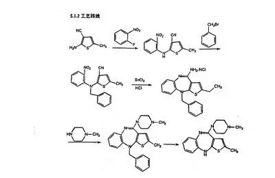 国家药监局2010年9月8日颁发给华生公司的《药品补充申请批件》所附《奥氮平药品补充申请注册资料》中,5.1“原料药生产工艺的研究资料及文献资料”之5.1.2“工艺路线”中绘制的反应路线如下: